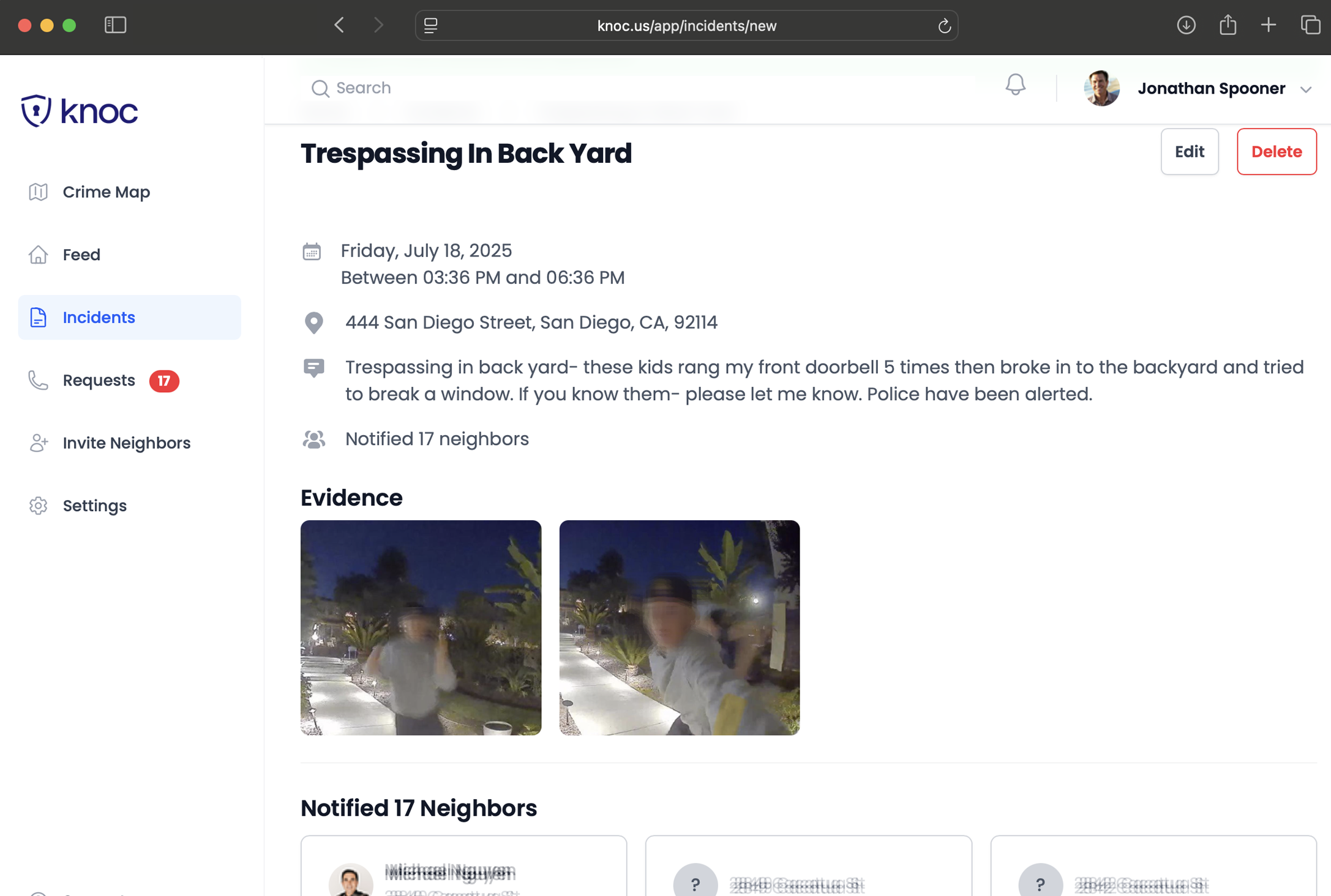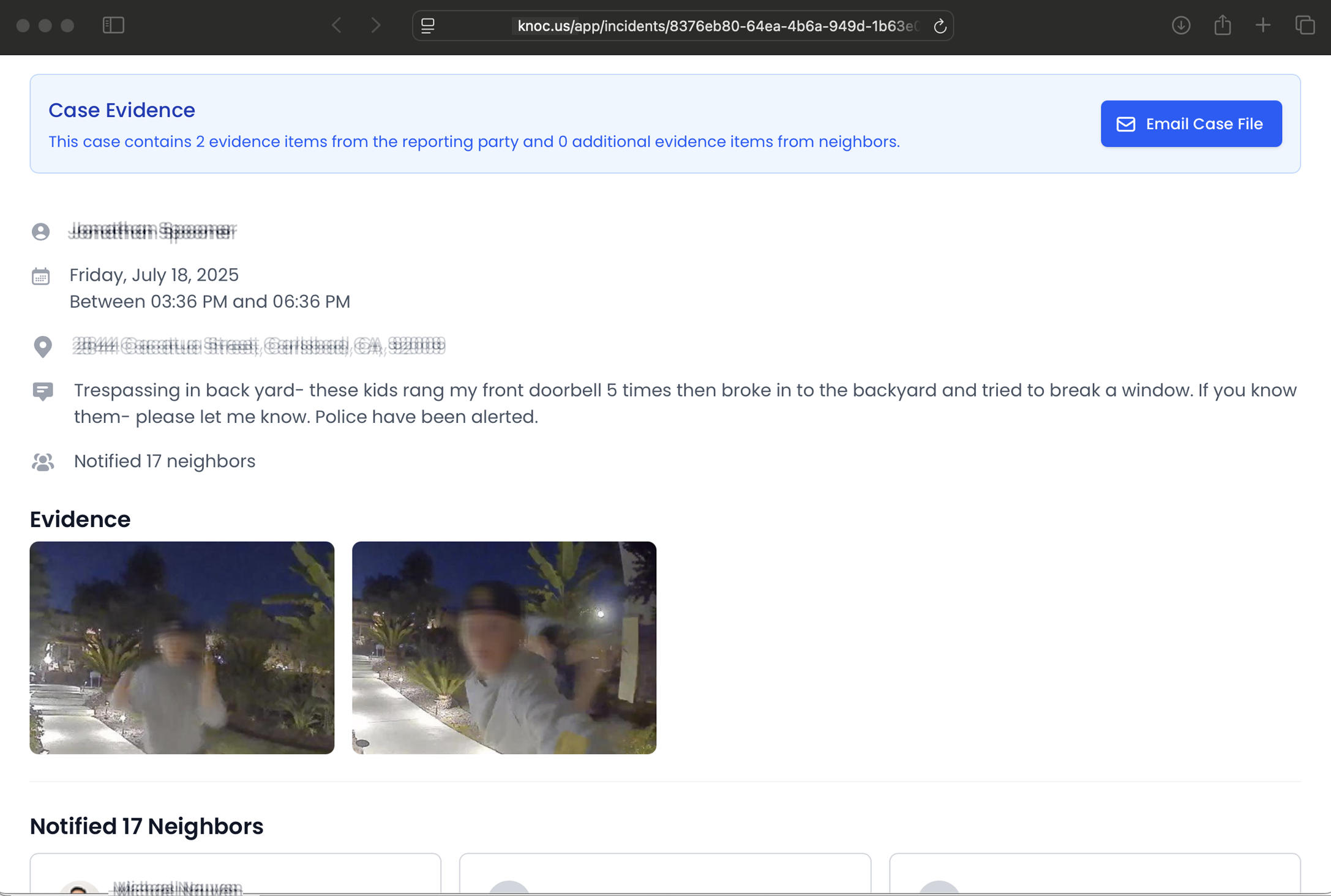 You could manage without Knoc, but it would require connecting with every neighbor in your area, letting them know you’re willing to share your camera footage, and exchanging contact information with each of them. Knoc simplifies this by reaching beyond just your immediate neighbors, which is especially helpful for tracking a burglar as they move across different streets.